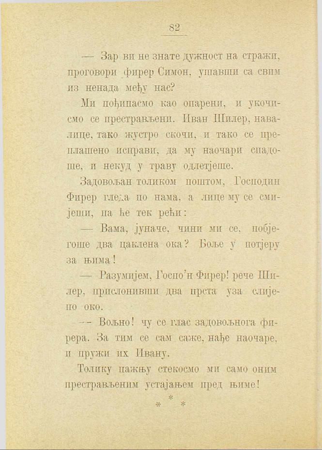 — Вољно! чу се глас задовољнога фирера. За тим се сам саже, нађе наочаре, и пружи их Ивану.