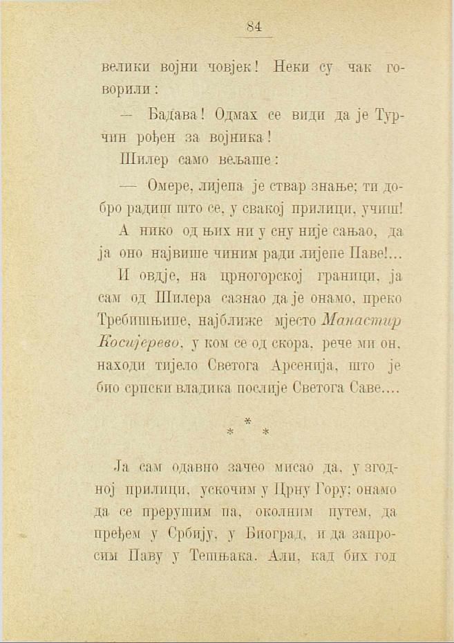 И овдје, на црногорској граници, ја сам од Шилера сазнао да је онамо, преко Требишњице, најближе мјесто Манастир Косијерево, у ком се од скора, рече ми он, находи тијело Светога Арсенија, што је био српски владика послије Светога Саве....