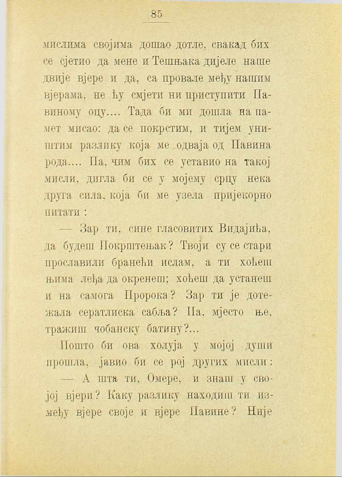 мислима својима дошао дотле, свакад бих се сјетио да мене и Тешњака дијеле наше двије вјере и да, са провале међу нашим вјерама, не ћу смјети ни приступити Павиному оцу.... Тада би ми дошла на памет мисао: да се покрстим, и тијем уништим разлику која ме одваја од Павина рода Па, чим бих се уставио на такој мисли, дигла би се у мојему срцу нека друга сила, која би ме узела пријекорно питати: