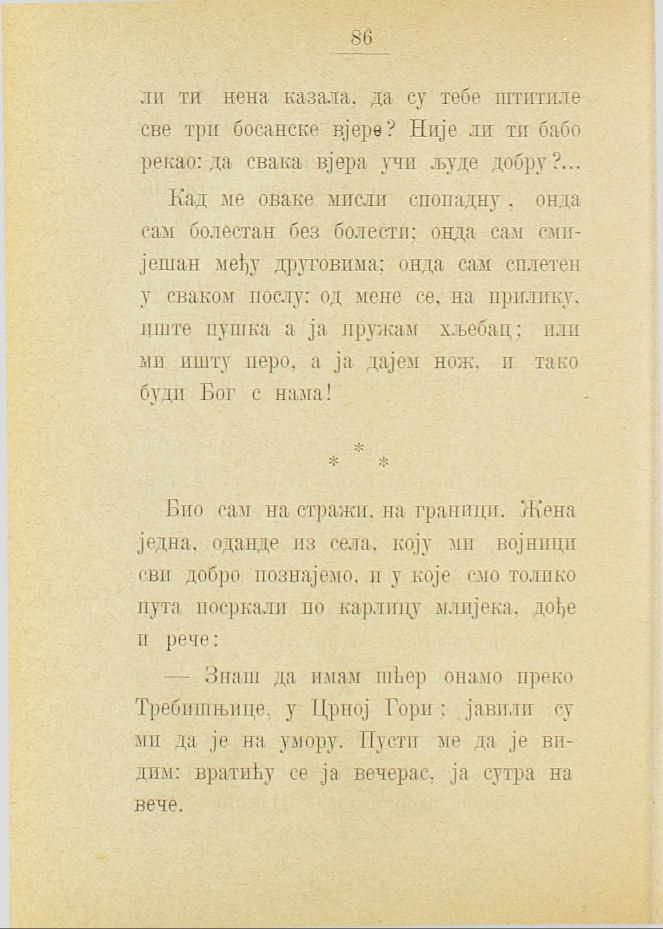 — Знаш да имам шћер онамо преко Требишњице, у Црној Гори: јавили су ми да је па умору. Пусти ме да је видим: вратићу се ја вечерас, ја сутра на вече.
