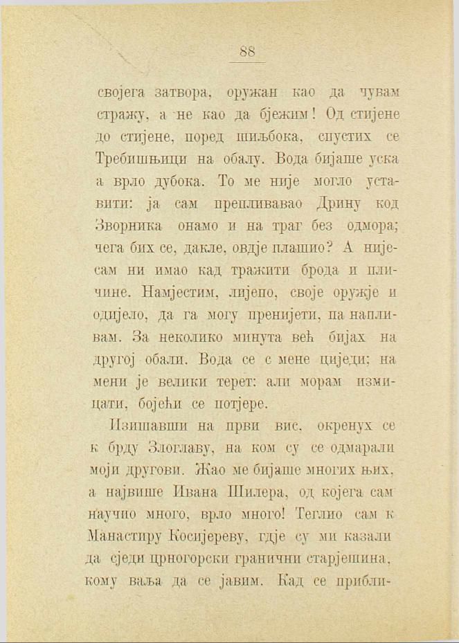 својега затвора, оружан као да чувам стражу, а не као да бјежим! Од стијене до стијене, поред шиљбока, спустих се Требишњици на обалу. Вода бијаше уска а врло дубока. То ме није могло уставити: ја сам препливавао Дрину код Зворника онамо и на траг без одмора; чега бих се, дакле, овдје плашио? А нијесам ни имао кад тражити брода и пличине. Намјестим, лијепо, своје оружје и одијело, да га могу пренијети, па напливам. За неколико минута већ бијах на другој обали. Вода се с мене циједи: на мени је велики терет: али морам измицати, бојећи се потјере.
