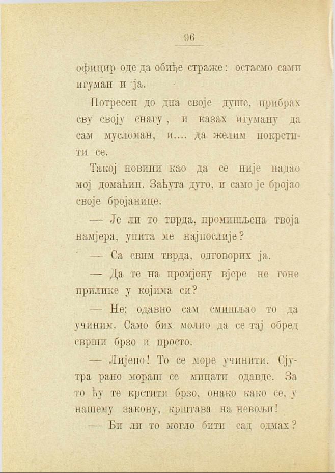 — Лијепо! То се море учинити. Сјутра рано мораш се мицати одавде. За то ћу те крстити брзо, онако како се, у нашему закону, крштава на невољи!