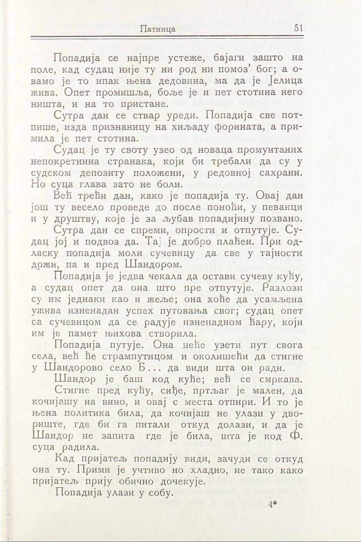 Сутра дан се спреми, опрости и отпутује. Судац јој и подвоз да. Тај је добро плаћен. При одласку попадија моли сучевицу да све у тајности држи, па и пред Шандором. '