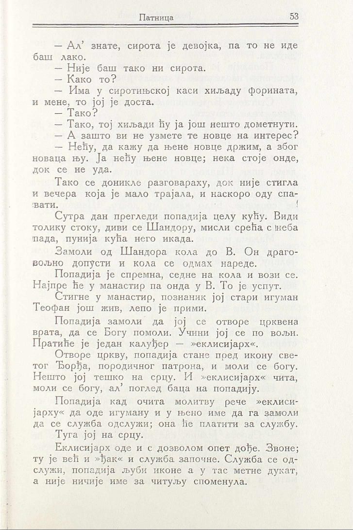 Отворе цркву, попадија стане пред икону светог Ђорђа, породичног патрона, и моли се богу. Нешто јој тешко на срцу. И »еклисијарх« чита, моли се богу, ал’ поглед баца на попадију.