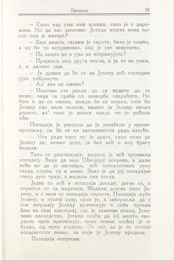 — Малочас сте рекли да га нудите да се жени; онда га треба од женидбе одвраћати. Но баш и да се ожени, можда би се нашла, која би Јелицу као мати волела; видите ја Јелицу нисам родила, ал’ тако је волим канда ми је рођена кћи.