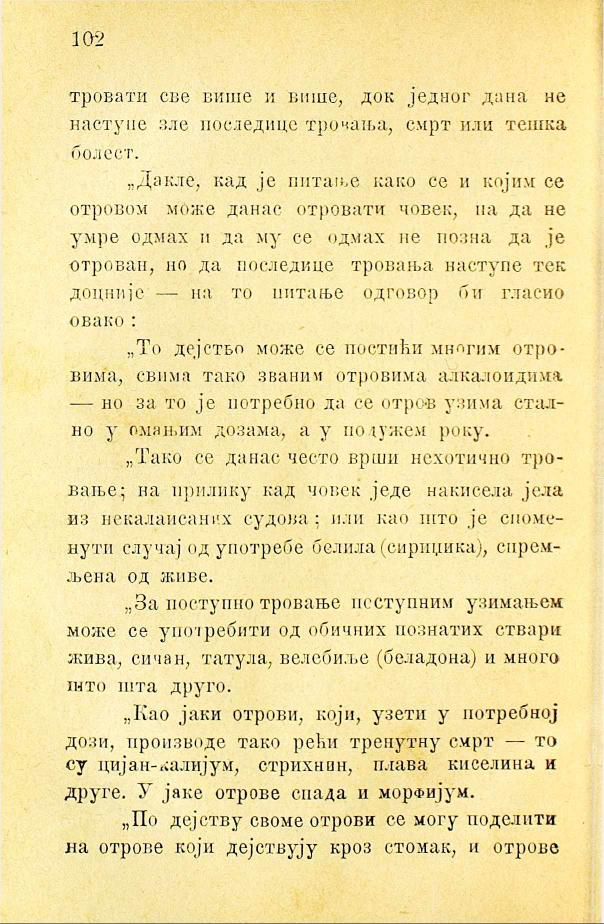 „Дакле, кад је питање како се и којим се отровом може данас отровати човек, па да не умре одмах и да му се одмах не позна да је отрован, но да последице тровања наступе тек доцније — на то питање одговор би гласио овако: