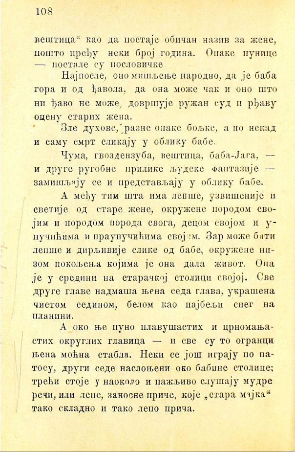А међу тим шта има лепше, узвишеније и светије од старе жене, окружене породом својим и породом порода свога, децом својом и унучићима и праунучићима својим. Зар може бити лепше и дирљивије слике од бабе, окружене низом покољења којима је она дала живот. Она је у средини на старачкој столици својој. Све друге главе надмаша њена седа глава, украшена чистом седином, белом као најбељи снег на планини.