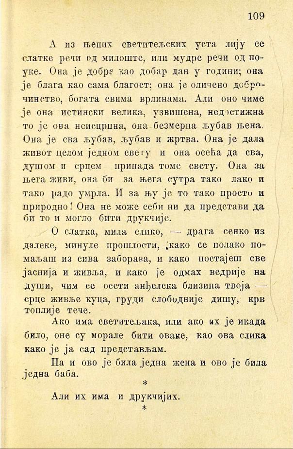 А из њених светитељских уста лију се слатке речи од милоште, или мудре речи од поуке. Она је добра као добар дан у години; она је блага као сама благост; она је оличено доброчинство, богата свима врлинама. Али оно чиме је она истински велика, узвишена, недостижна то је она неисцрпна, она безмерна љубав њена. Она је сва љубав, љубав и жртва. Она је дала живот целом једном свету и она осећа да сва, душом и срцем припада томе свету. Она за њега живи, она би за њега сутра тако лако и тако радо умрла. И за њу је то тако просто и природно! Она не може себи ни да представи да би то и могло бити друкчије.