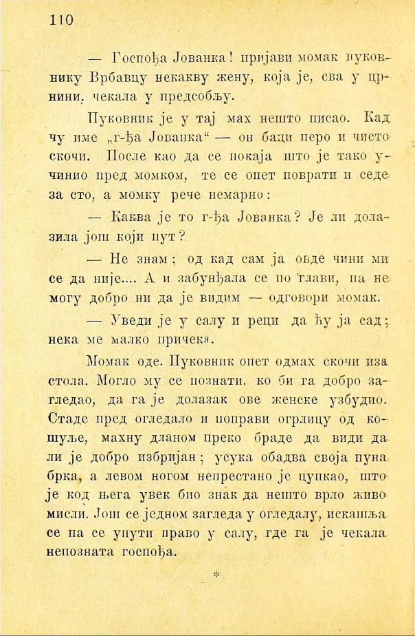 — Госпођа Јованка! пријави момак пуковнику Врбавцу некакву жену, која је, сва у црнини, чекала у предсобљу.