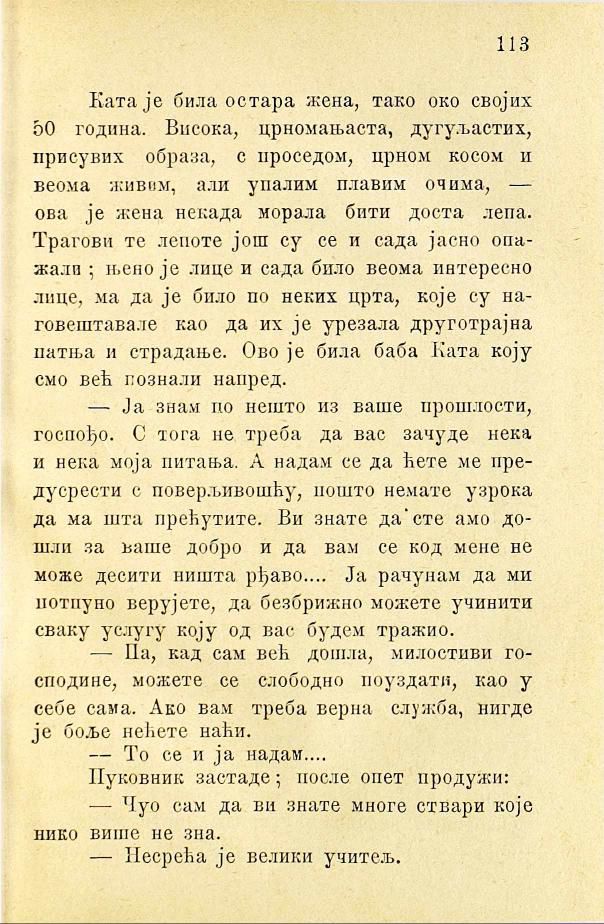 Ката је била остара жена, тако око својих 50 година. Висока, црномањаста, дугуљастих, присувих образа, с проседом, црном косом и веома живим, али упалим плавим очима, — ова је жена некада морала бити доста лепа. Трагови те лепоте још су се и сада јасно опажали; њено је лице и сада било веома интересно лице, ма да је било по неких црта, које су наговештавале као да их је урезала дуготрајна патња и страдање. Ово је била баба Ката коју смо већ познали напред.