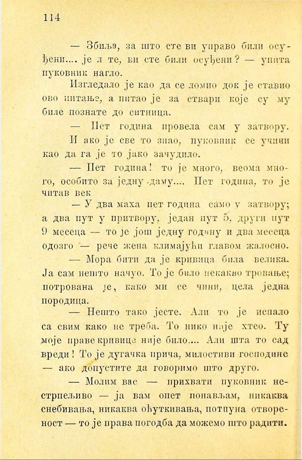 — Нешто тако јесте. Али то је испало са свим како не треба. То нико није хтео. Ту моје праве кривице није било.... Али шта то сад вреди! То је дугачка прича, милостиви господине — ако допустите да говоримо што друго.