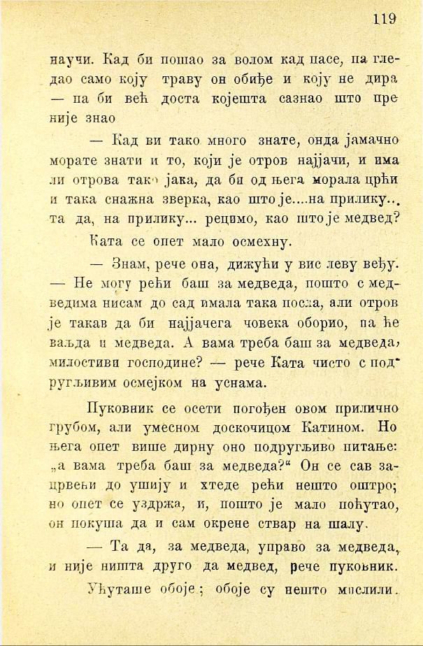 — Знам, рече она, дижући у вис леву веђу. — Не могу рећи баш за медведа, пошто с медведима нисам до сад имала така посла, али отров је такав да би најјачега човека оборио, па ће ваљда и медведа. А вама треба баш за медведа, милостиви господине? — рече Ката чисто с подругљивим осмејком на уснама.