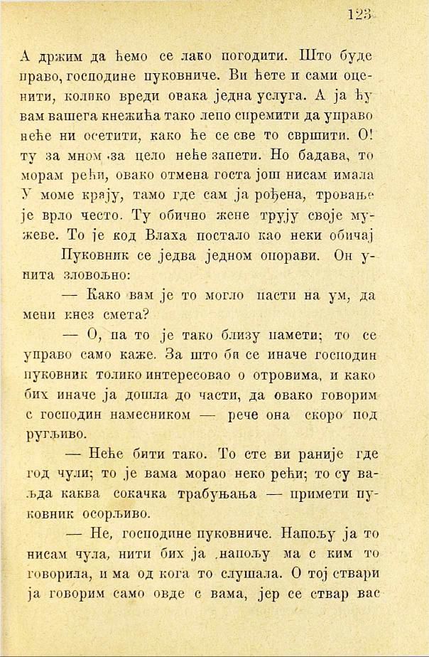 А држим да ћемо се лако погодити. Што буде право, господине пуковниче. Ви ћете и сами оценити, колико вреди овака једна услуга. А ја ћу вам вашега кнежића тако лепо спремити да управо неће ни осетити, како ће се све то свршити. О! ту за мном за цело неће запети. Но бадава, то морам рећи, овако отмена госта још нисам имала. У моме крају, тамо где сам ја рођена, тровање је врло често. Ту обично жене трују своје мужеве. То је код Влаха постало као неки обичај.