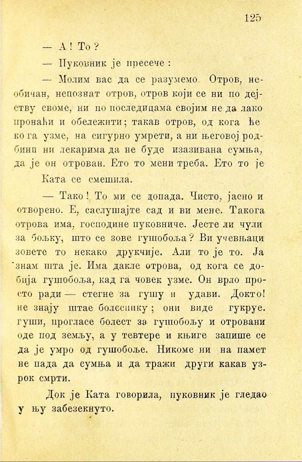 — Тако! То ми се допада. Чисто, јасно и отворено. Е, саслушајте сад и ви мене. Такога отрова има, господине пуковниче. Јесте ли чули за бољку, што се зове гушобоља? Ви учевњаци зовете то некако друкчије. Али то је то. Ја знам шта је. Има дакле отрова, од кога се добија гушобоља, кад га човек узме. Он врло просто ради — стегне за гушу и удави. Доктори не знају шта је болеснику; они виде гукруе, гуши, прогласе болест за гушобољу и отровани оде под земљу, а у тевтере и књиге запише се да је умро од гушобоље. Никоме ни на памет не пада да сумња и да тражи други какав узрок смрти.
