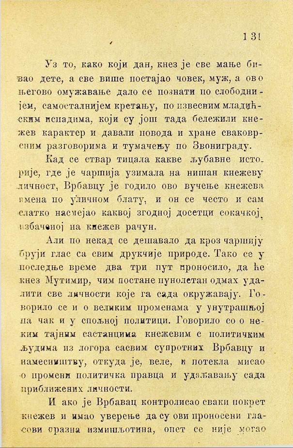 Али по некад се дешавало да кроз чаршију бруји глас са свим друкчије природе. Тако се у последње време два три пут проносило, да ће кнез Мутимир, чим постане пунолетан одмах удалити све личности које га сада окружавају. Говорило се и о великим променама у унутрашњој па чак и у спољној политици. Говорило со о неким тајним састанцима кнежевим с политичким људима из логора сасвим супротних Врбавцу и намесништву, откуда је, веле, и потекла мисао о промени политичка правца и удаљавању сада приближених личности.