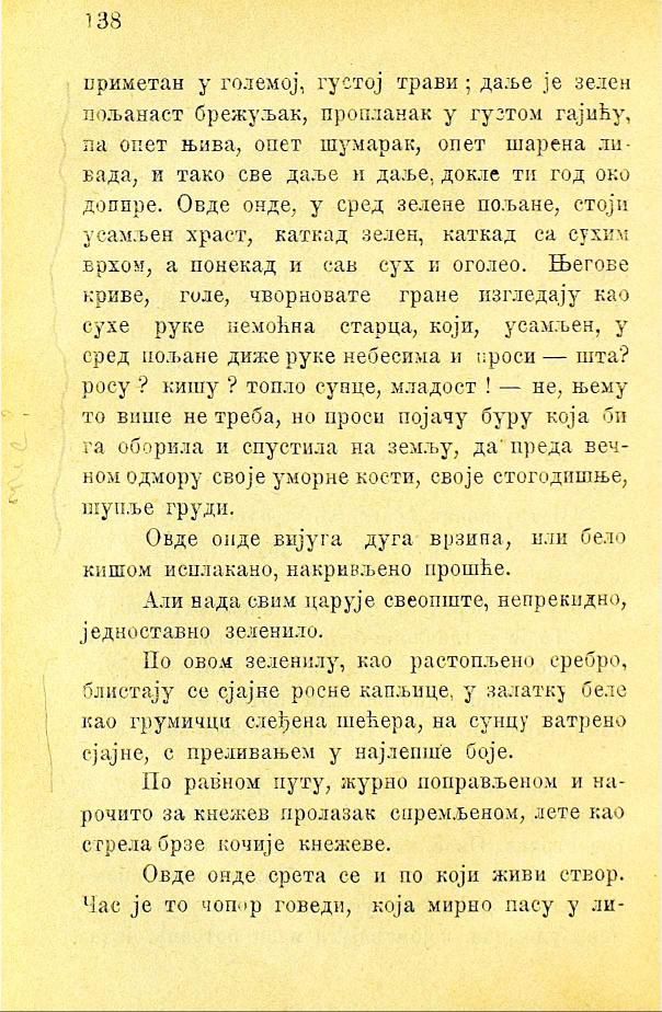 приметан у големој, густој трави; даље је зелен пољанаст брежуљак, пропланак у густом гајићу, па опет њива, опет шумарак, опет шарена ливада, и тако све даље и даље, докле ти год око допире. Овде онде, у сред зелене пољане, стоји усамљен храст, каткад зелен, каткад са сухим врхом, а понекад и сав сух и оголео. Његове криве, голе, чворновате гране изгледају као сухе руке немоћна старца, који, усамљен, у сред пољане диже руке небесима и проси - шта? росу? кишу? топло сунце, младост! — не, њему то више не треба, но проси појачу буру која би га оборила и спустила на земљу, да преда вечном одмору своје уморне кости, своје стогодишње, шупље груди.