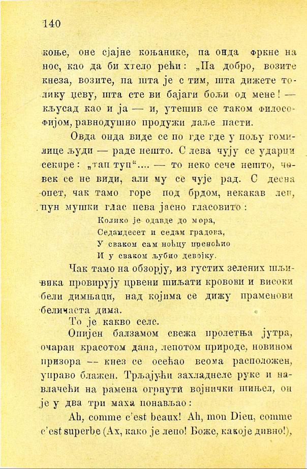Опијен балзамом свежа пролетња јутра, очаран красотом дана, лепотом природе, новином призора — кнез се осећао веома расположен, управо блажен. Трљајући захладнеле руке и навлачећи на рамена огрнути војнички шињел, он те у два три маха понављао: