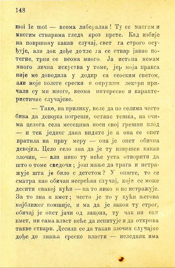 — веома либералан! Ту се многим и многим стварима гледа кроз прсте. Кад избије на површину какав случај, свет га строго осуђује, али док дође дотле да се ствар јавно потегне, трпи се веома много. Ја истина немам много лична искуства у томе, јер моја пракса није ме доводила у додир са сеоским светом, али моје колеге срески и окружни лекари причали су ми многе, веома интересне и карактеристичне случајеве.— Тако, на прилику, веле да по селима често бива да девојка погреши, остане тешка, на очима целога села месецима носи свој грешни плод — и тек једног дана видате је а она се опет вратила на прву меру — она је опет обична девојка. Цело село зна да је ту извршен какав злочин, — али нико ту неће уста отворити да што о томе сведочи; још мање да трага и истражује шта је било с дететом? У опште, то се сматра као обичан несрећан случај, који се може десити свакој кући — па то нико и не истражује. За то зна и кмет; често је то у кући његова најближег комшије, и ма да је закон ту строг, обичај је опет јачи од закона, ту чак ни сам кмет, ни сама власт неће да испитује и да открива такве ствари. Деси ли се да такав злочин случајно дође до знања среске власти — иследник