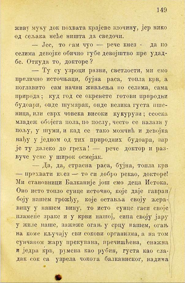 — Да, да, страсна раса, бујна, топла, крв — прихвати кнез — то си добро рекао, докторе! Ми становници Балканије још смо деца Истока. Оно исто топло сунце источно, које даје гавран боју нашем грожђу, које оставља своју жеравицу у нашем вину, то исто сунце гаси своје пламене зраке и у крви нашој, сипа своју јару у жиле наше, зажиже огањ у срцу нашем, огањ на коме кључају сви сокови организма, а на том сунчаном жару прекувана, пречишћена, снажна и једра крв, румена као рубин, густа као сладак сок са узрела чокота балканиског, надима