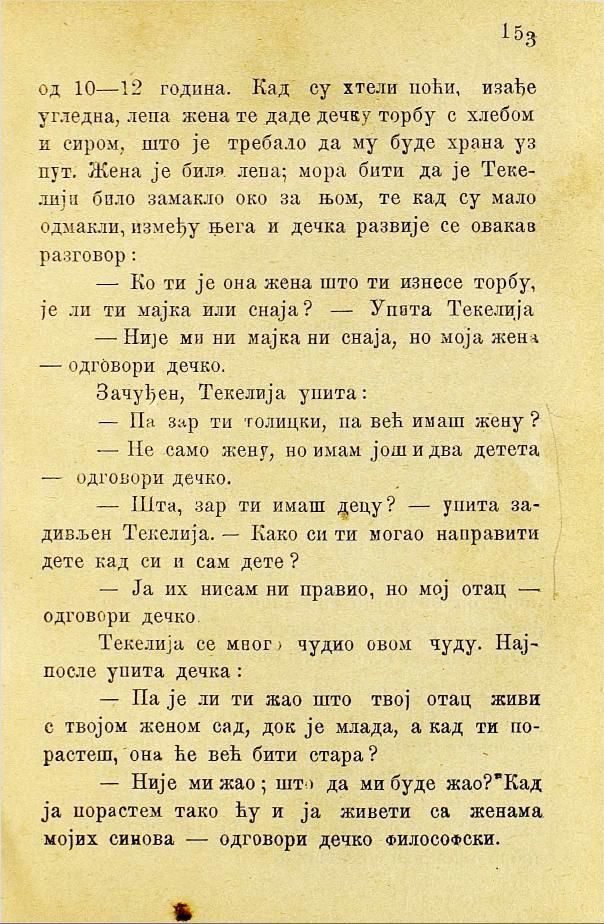 — Није ми жао; што да ми буде жао? Кад ја порастем тако ћу и ја живети са женама мојих синова — одговори дечко философски.