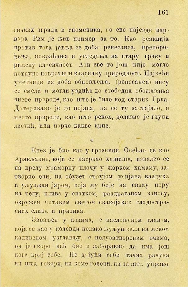 зграда и споменика, но све најезде варвара. Рим је жив пример за то. Као реакција против тога јавља се доба ренесанса, препорођења, повраћања и угледања на стару грчку и римску класичност. Али све то још није могло потпуно повратити класичну природност. Највећи уметници из доба обновљења, (ренесанса) нису се смели и могли уздићи до слободна обожавања чисте природе, као што је било код старих Грка. Дотеривано је до појаса, па се ту застајало, и место природе, као што рекох, долазио је глупи листић, или парче какве крпе.