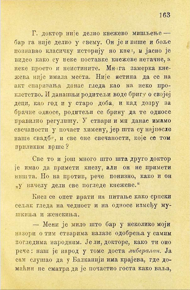 Г. доктор није делио кнежево мишљење — бар га није делио у свему. Он је и више и боље познавао класичку историју но кнез, и јасно је видео како су неке поставке кнежеве нетачне, а неке просто и неистините. Многа замерка кнежева није имала места. Није истина да се на акт спаривања данас гледа као на неко проклетство. И данашњи родитељи воде бригу о својој деци, као год и у старо доба; и кад дозру за брачне односе, родитељи се брину да те односе правилно регулишу. У ствари и ми данас имамо свечаности у почаст химену, јер шта су најпосле наше свадбе, и све оне свечаности, које се том приликом врше?