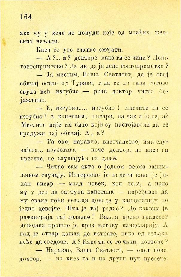 — Читао сам акта о једном веома занимљивом случају. Интересно је видети како је један писар — млад човек, хоп лола, а пало му у део да заступа капетана — наређивао да му сваке ноћи сељаци доводе у канцеларију по једно девојче. Шта је тај радио? До каквих је рафинерија тај долазио! Ваљда преко тридесет девојака прошло је кроз његову канцеларију. А кад је ствар дошла до истраге, нико од сељака неће да сведочи. А? Како ти се то чини, докторе?