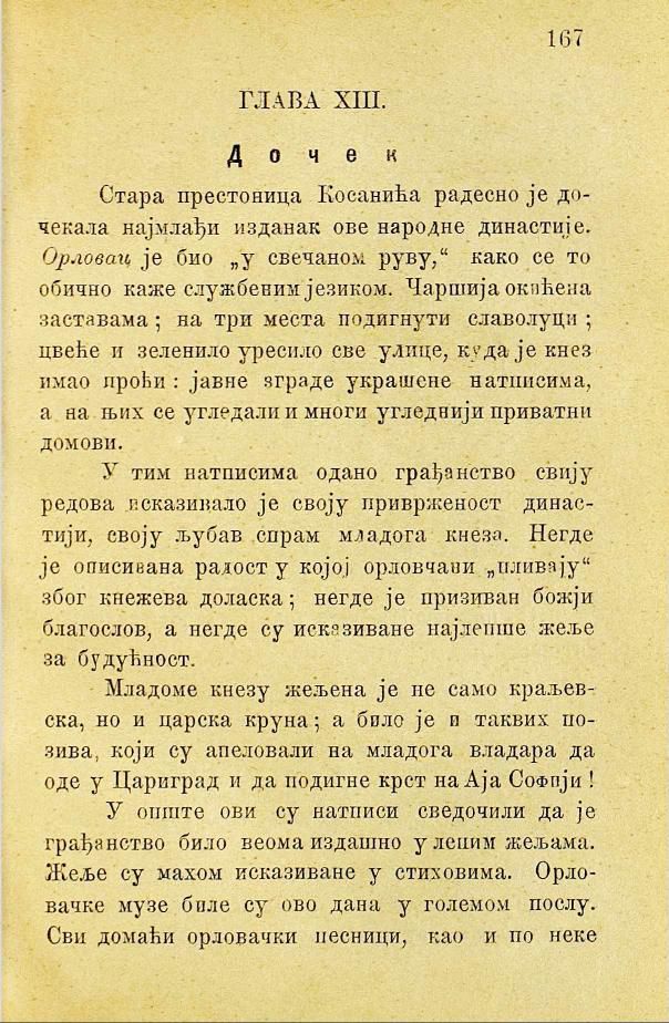 Стара престоница Косанића радосно је дочекала најмлађи изданак ове народне династије. Орловац је био „у свечаном руву,“ како се то обично каже службеним језиком. Чаршија окићена заставама; на три места подигнути славолуци; цвеће и зеленило уресило све улице, куда је кнез имао проћи: јавне зграде украшене натписима, а на њих се угледали и многи угледнији приватни домови.