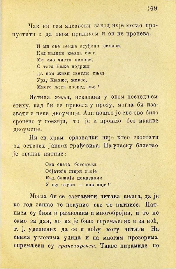 Могла би се саставити читава књига, да је ко год зашао те покупио све те натписе. Натписи су били и разнолики и многобројни, и то не само за дан, но их је било спремљених и за ноћ, т. ј. удешених да се и ноћу могу читати. На свима угловима улица и на многим прозорима спремљени су транспаренти. Такве пирамиде по