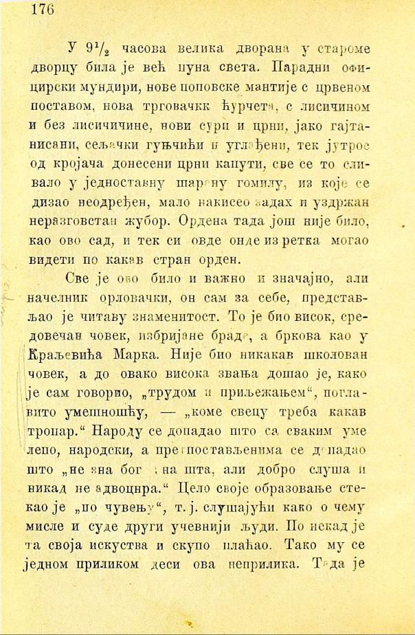 У 9½ часова велика дворана у староме дворцу била је већ пуна света. Парадни официрски мундири, нове поповске мантије с црвеном поставом, нова трговачка ћурчета, с лисичином и без лисичине, нови сури и црни, јако гајтанисани, сељачки гуњчићи и углађени, тек јутрос од кројача донесени црни капути, све се то сливало у једноставну шарену гомилу, из које се дизао неодређен, мало накисео задах и уздржан неразговетан жубор. Ордена тада још није било, као ово сад, и тек си овде онде из ретка могао видети по какав стран орден.