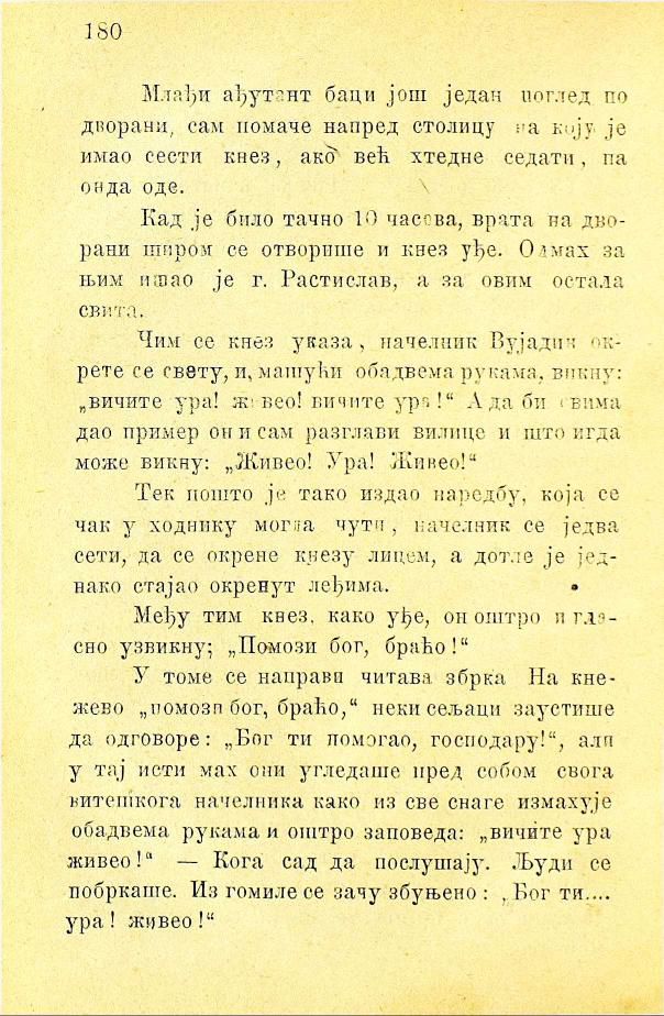 Чим се кнез указа, начелник Вујадин окрете се свету, и, машући обадвема рукама, викну: „вичите ура! живео! вичите ура!“ А да би овима дао пример он и сам разглави вилице и што игда може викну: „Живео! Ура! Живео!“