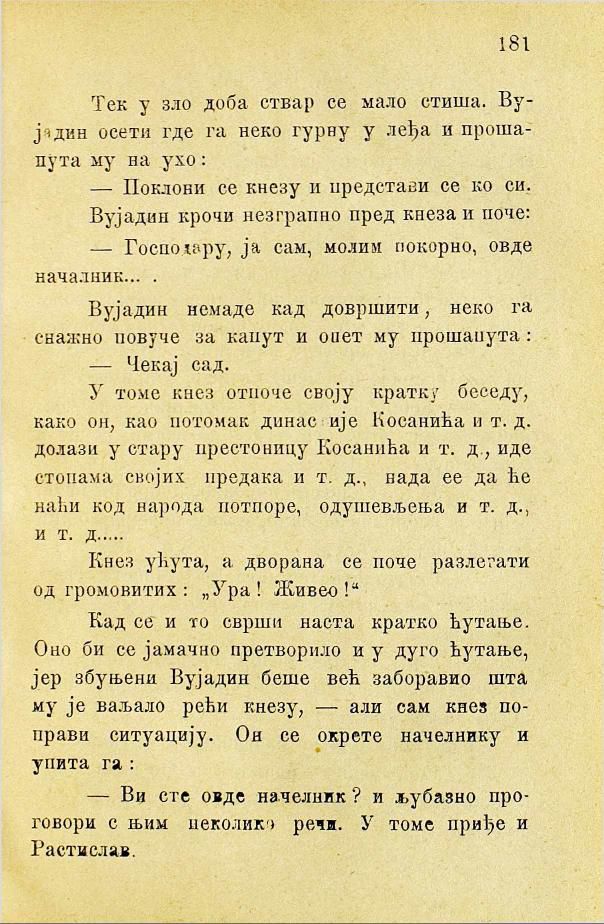 Кад се и то сврши наста кратко ћутање. Оно би се јамачно претворило и у дуго ћутање, јер збуњени Вујадин беше већ заборавио шта му је ваљало рећи кнезу, — али сам кнез поправи ситуацију. Он се окрете начелнику и упита га:
