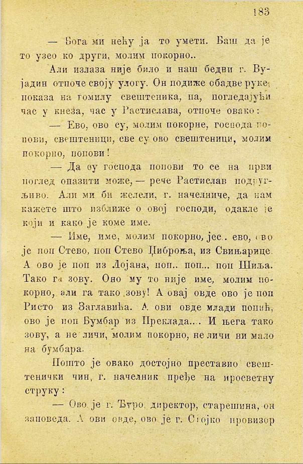 — Име, име, молим покорно, јес, ево, ово је поп Стево, поп Стево Џиброња, из Свињарице. А ово је поп из Лојана, поп... поп... поп Шиља. Тако га зову. Оно му то није име, молим покорно, али га тако зову! А овај овде ово је поп Ристо из Заглавића. А ови овде млади попић, ово је поп Бумбар из Преклада.... И њега тако зову, а не личи, молим покорно, не личи ни мало на бумбара.