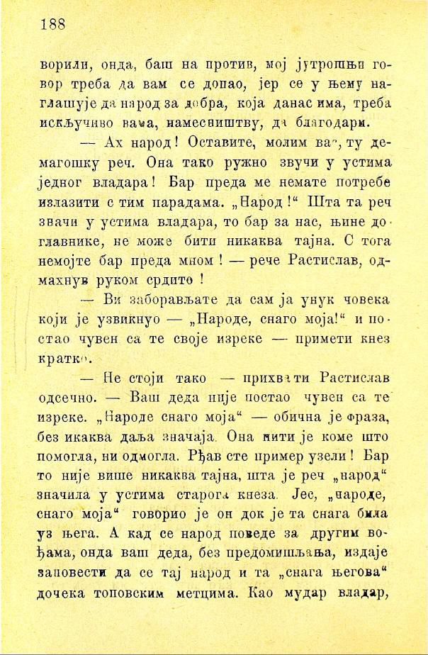 — Ах народ! Оставите, молим вас, ту демагошку реч. Она тако ружно звучи у устима једног владара! Бар преда ме немате потребе излазити с тим парадама. „Народ!“ Шта та реч значи у устима владара, то бар за нас, њине доглавнике, не може бити никаква тајна. С тога немојте бар преда мном! — рече Растислав, одмахнув руком срдито!