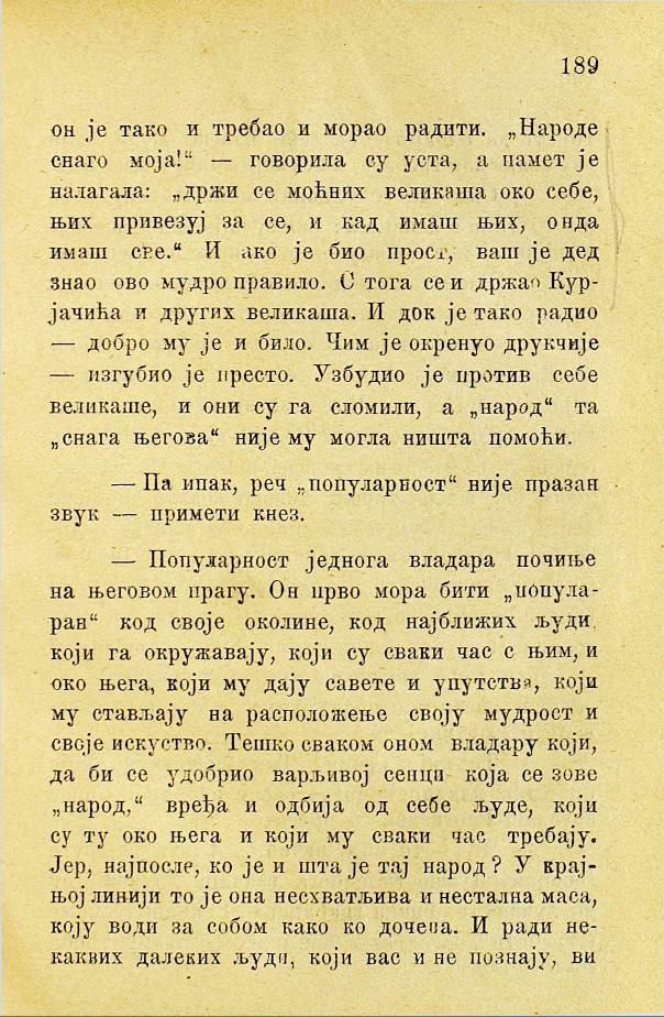 он је тако и требао и морао радити. „Народе снаго моја!“ — говорила су уста, а памет је налагала: „држи се моћних великаша око себе, њих привезуј за се, и кад имаш њих, онда имаш све.“ И ако је био прост, ваш је дед знао ово мудро правило. С тога се и држао Курјачића и других великаша. И док је тако радио — добро му је и било. Чим је окренуо друкчије — изгубио је престо. Узбудио је против себе великаше, и они су га сломили, а „народ“ та „снага његова“ није му могла ништа помоћи.