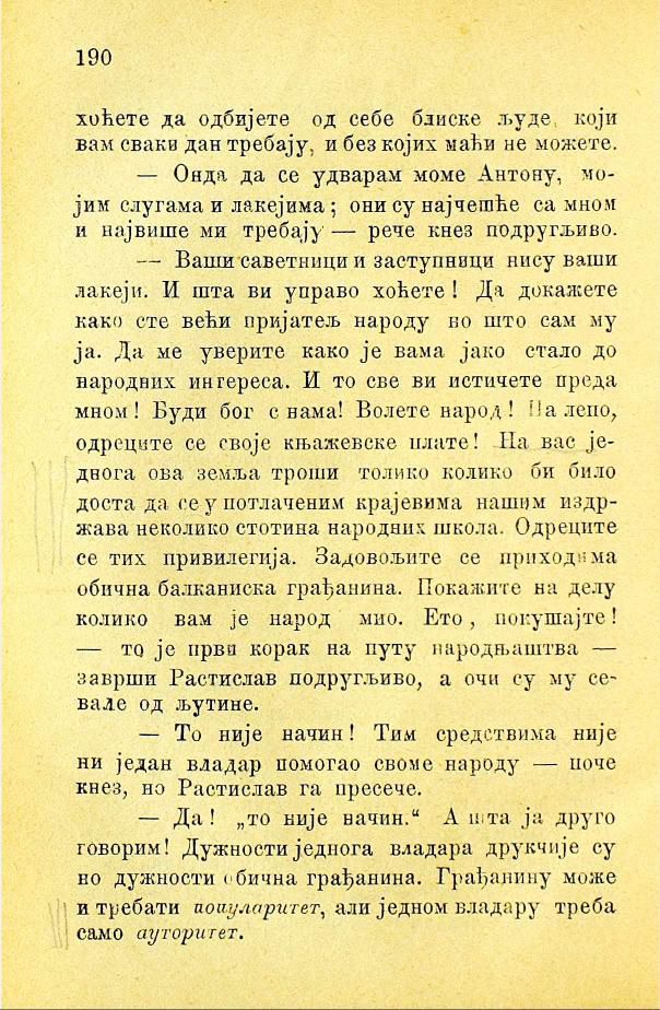 — Ваши саветници и заступници нису ваши лакеји. И шта ви управо хоћете! Да докажете како сте већи пријатељ народу но што сам му ја. Да ме уверите како је вама јако стало до народних интереса. И то све ви истичете преда мном! Буди бог с нама! Волете народ! Па лепо, одреците се своје књажевске плате! На вас једнога ова земља троши толико колико би било доста да се у потлаченим крајевима нашим издржава неколико стотина народних школа. Одреците се тих привилегија. Задовољите се приходима обична балканиска грађанина. Покажите на делу колико вам је народ мио. Ето, покушајте! — то је први корак на путу народњаштва — заврши Растислав подругљиво, а очи су му севале од љутине.