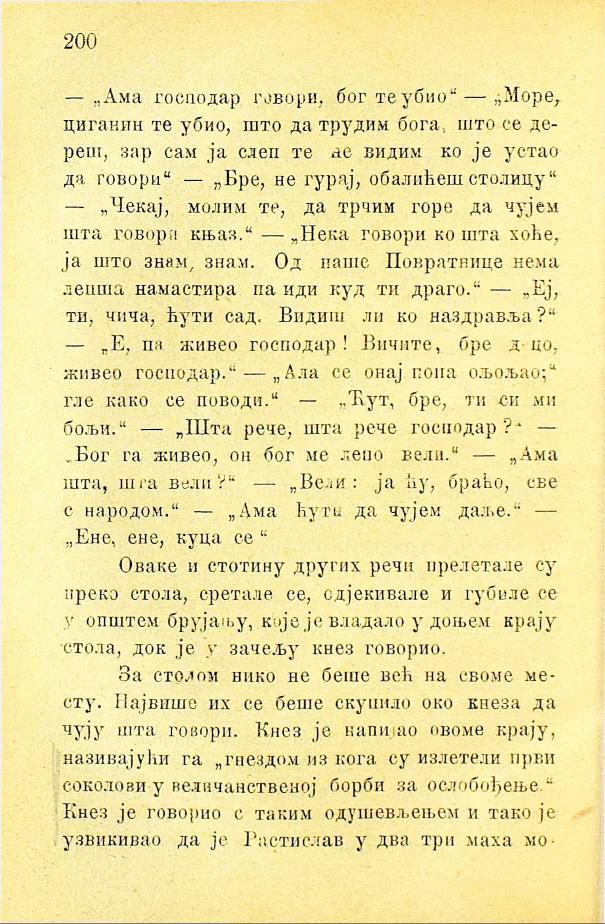 — „Ама господар говори, бог те убио“ — „Море, циганин те убио, што да трудим бога, што се дереш, зар сам ја слеп те не видим ко је устао да говори“ — „Бре, не гурај, обалићеш столицу“ — „Чекај, молим те, да трчим горе да чујем шта говора књаз.“ —„Нека говори ко шта хоће, ја што знам, знам. Од наше Повратнице нема лепша намастира па иди куд ти драго.“ — „Еј, ти, чича, ћути сад. Видиш ли ко наздравља?“ — „Е, па живео господар! Вичите, бре децо, живео господар.“ — „Ала се онај попа ољољао;“ гле како се поводи.“ — „Ћут, бре, ти си ми бољи.“ — „Шта рече, шта рече господар?“ — „Бог га живео, он бог ме лепо вели.“ — „Ама шта, шта вели?“ — „Вели: ја ћу, браћо, све с народом.“ — „Ама ћути да чујем даље.“ — „Ене, ене, куца се.“