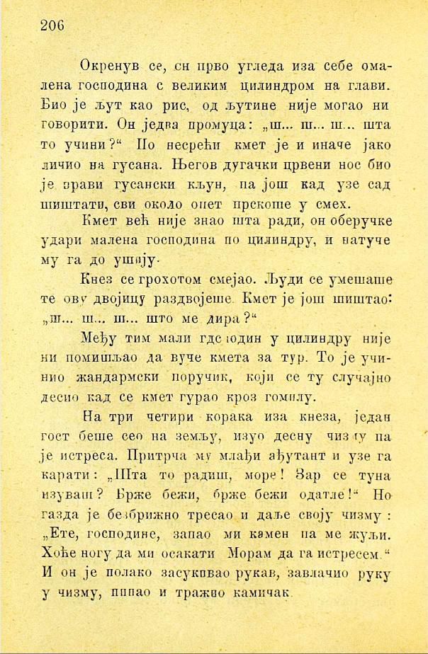Окренув се, си прво угледа иза себе омалена господина с великим цилиндром на глави. Био је љут као рис, од љутине није могао ни говорити. Он једва промуца: „ш... ш... ш... шта то учини?“ По несрећи кмет је и иначе јако личио на гусана. Његов дугачки црвени нос био је прави гусански кљун, па још кад узе сад шиштати, сви около опет прскоше у смех.