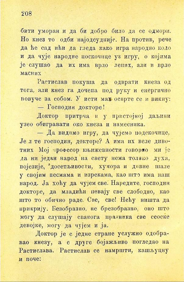 — Да видимо игру, да чујемо подскочице, Је л те господин, докторе? А има их веле дивотних. Мој професор књижевности говорио ми је да ни један народ на свету нема толико духа, појезије, досетљивости, хумора и дивне шале у својим песмама и изрекама, као што има наш народ. Ја хоћу да чујем све. Наредите, господин докторе, да младићи певају све слободно, као што то обично раде. Све, све! Нећу ништа да прикрију. Безобразно, не брезобразно, оно што могу да слушају свакога празника све сеоске девојке, могу да чујем и ја.