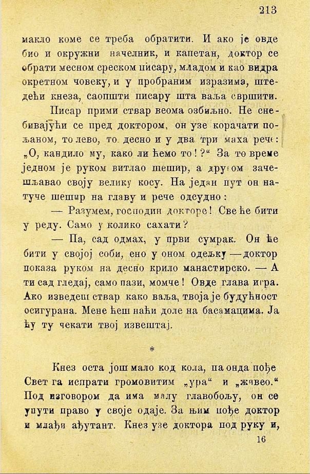 коме се треба обратити. И ако је овде био и окружни начелник, и капетан, доктор се обрати месном среском писару, младом и као видра окретном човеку, и у пробраним изразима, штедећи кнеза, саопшти писару шта ваља свршити.