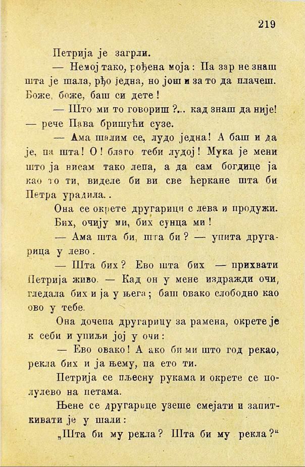 — Ама шалим се, лудо једна! А баш и да је, па шта! О! благо теби лудој! Мука је мени што ја нисам тако лепа, а да сам богдице ја као то ти, виделе би ви све ћеркане шта би Петра урадила.