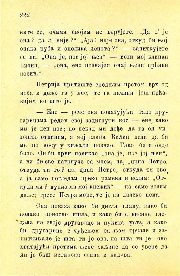 — Ене — рече она, показујући тако другарицама редом свој задигнути нос — ене, како ми је леп нос; по некад ми дође да га од милоште откинем, а мој клипа Вилип вели да би ме по носу у хиљади познао. Тако би и овде било. Он би први повикао „она је, пос јој њен“, а ви би све нагрнуле за мном, па, „црна Петро, откуда ти то? па, црна Петро, откуда ти ово? а ја само погледам преко рамена и велим: „Откуда ми? купио ми мој кнежић“ — па само возим даље; тресе Петра море, те је на далеко нема.