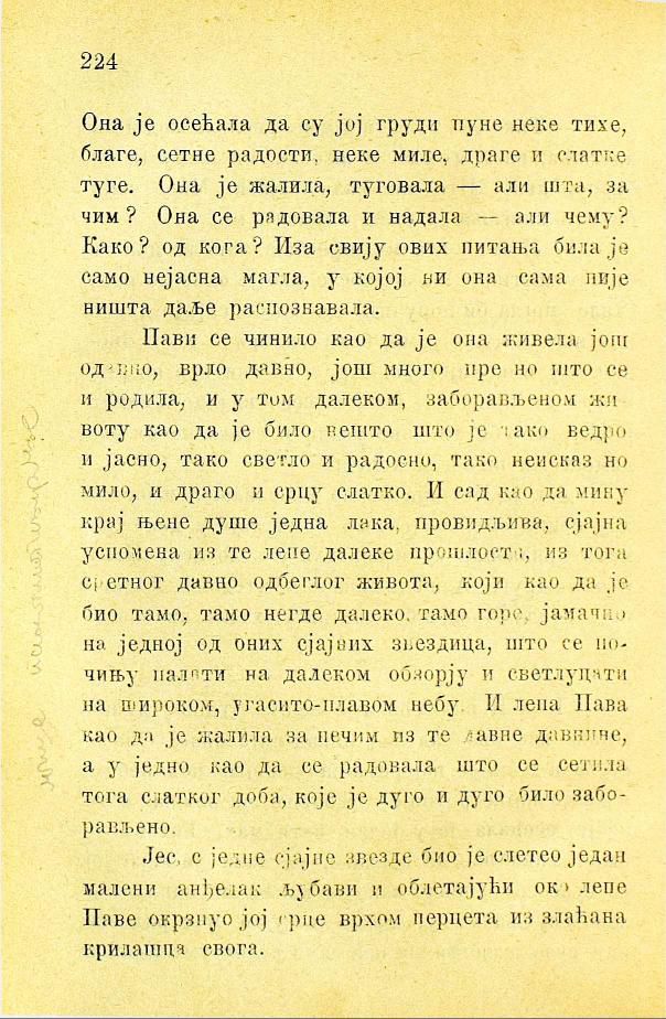 Пави се чинило као да је она живела још одавно, врло давно, још много пре но што се и родила, и у том далеком, заборављеном животу као да је било вешто што је тако ведро и јасно, тако светло и радосно, тако неисказано мило, и драго и срцу слатко. И сад као да мину крај њене душе једна лака, провидљива, сјајна успомена из те лепе далеке прошлости, из тога сретног давно одбеглог живота, који као да је био тамо, тамо негде далеко, тамо горе, јамачно на једној од оних сјајних звездица, што се почињу палити на далеком обзорју и светлуцати на широком, угасито-плавом небу. И лепа Пава као да је жалила за нечим из те давне давнине, а у једно као да се радовала што се сетила тога слатког доба, које је дуго и дуго било заборављено.