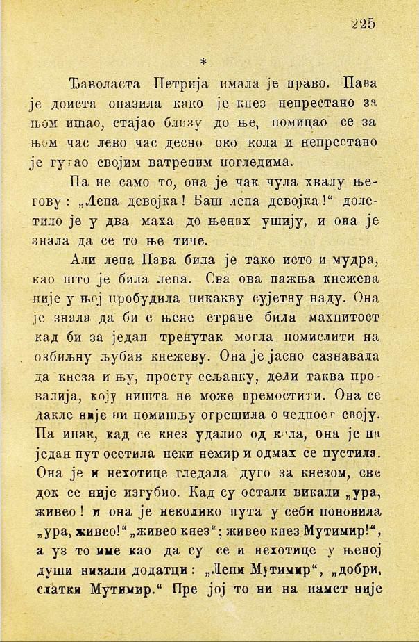 Али лепа Пава била је тако исто и мудра, као што је била лепа. Сва ова пажња кнежева није у њој пробудила никакву сујетну наду. Она је знала да би с њене стране била махнитост кад би за један тренутак могла помислити на озбиљну љубав кнежеву. Она је јасно сазнавала да кнеза и њу, просту сељанку, дели таква провалија, коју ништа не може премостити. Ова се дакле није ни помишљу огрешила о чедност своју. Па ипак, кад се кнез удалио од кола, она је на један пут осетила неки немир и одмах се пустила. Она је и нехотице гледала дуго за кнезом, све док се није изгубио. Кад су остали викали „ура, живео! и она је неколико пута у себи поновила „ура, живео!“ „живео кнез“; „живео кнез Мутимир!“, а уз то име као да су се и нехотице у њеној души низали додатци: „Лепи Мутимир“, „добри, слатки Мутимир.“ Пре јој то ни на памет није