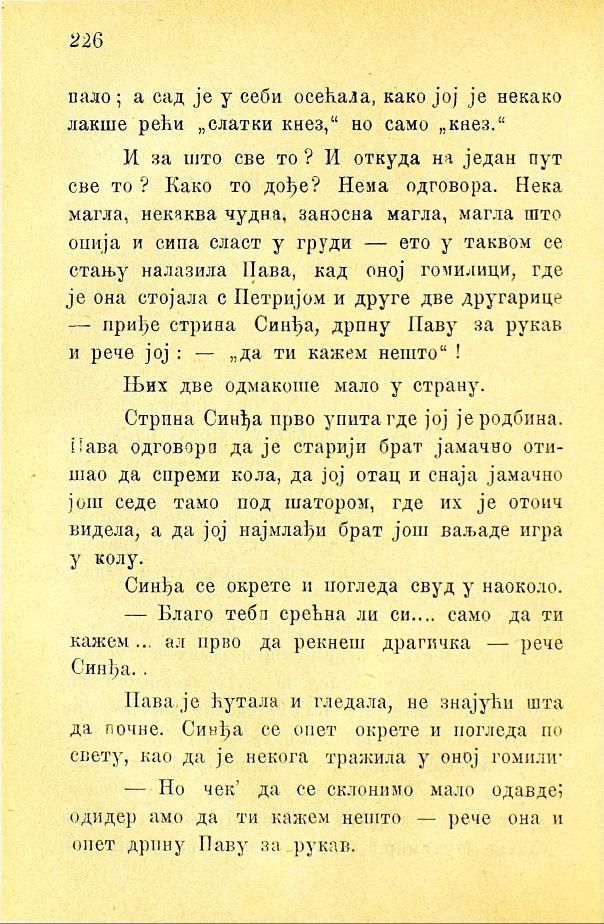 И за што све то? И откуда на један пут све то? Како то дође? Нема одговора. Нека магла, некаква чудна, заносна магла, магла што опија и сипа сласт у груди — ето у таквом се стању налазила Пава, кад оној гомилици, где је она стојала с Петријом и друге две другарице — приђе стрина Синђа, дрпну Паву за рукав и рече јој: — „да ти кажем нешто“!