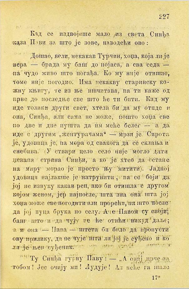 Дошао, вели, некакав Турчин, хоџа, која ли је вера — брада му баш до појаса, а сва седа — па чудо живо што погађа. Ко му није отишао, томе није погодио. Има некакву старинску кожну књигу, те из ње ишчитава, па ти каже од прве до последње све што ће ти бити. Кад му иде толики други свет, хтела би да му отиде и она, Синђа, али сама не може, пошто хоџа све по две и две пушта да им меће белег а да иде с другим „жентурачама“ — мрзи је. Сирота је, удовица је, па мора од свакога да се склања и снебива. (У ствари цело село није могло дати џевапа стрина Синђи, а ко је хтео да остане на миру морао је просто њу митити). Јадној удовици најлакше је натрунити, па се боји да јој не извуку какав реп, ако би отишла с другом којом женом, јер најпосле, шта зна она шта јој хоџа може све погодити или прорећи, па што после да јој пуца брука по селу. А с Павом су своји; баш што и да чују не ће отићи никуд даље; а и она - Пава - штета би било да пропусти ову прилику, да не чује шта ли јој је суђено и ко ли је њен суђеник.