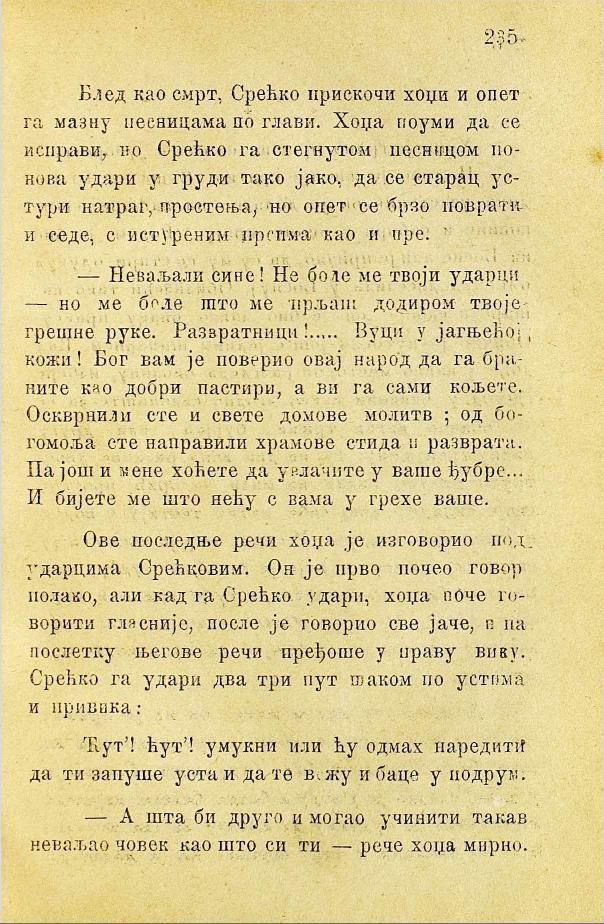 — Неваљали сине! Не боле ме твоји ударци — но ме боле што ме прљаш додиром твоје грешне руке. Развратници! Вуци у јагњећој кожи! Бог вам је поверио овај народ да га браните као добри пастири, а ви га сами кољете. Оскврнили сте и свете домове молитве; од богомоља сте направили храмове стида и разврата. Па још и мене хоћете да увлачите у ваше ђубре... И бијете ме што нећу с вама у грехе ваше.