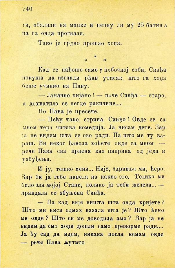 — Нећу тако, стрина Синђо! Овде се са мном тера читава комедија. Ја нисам дете. Зар не видим шта се ово ради. Па што ме ту вараш. Ви неког ђавола хоћете овде са мном — рече Пава сва црвена као паприка од једа и узбуђења.