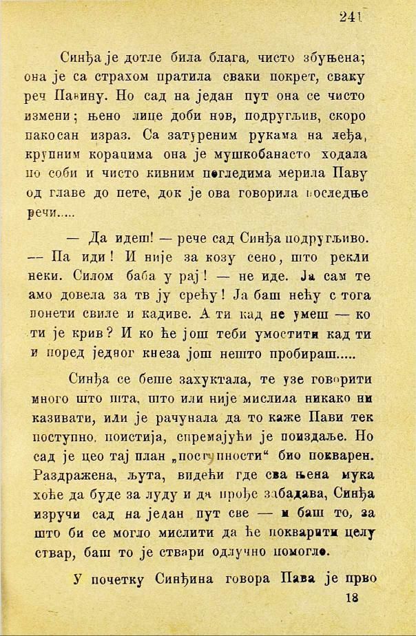 Синђа је дотле била блага, чисто збуњена; она је са страхом пратила сваки покрет, сваку реч Павину. Но сад на један пут она се чисто измени; њено лице доби нов, подругљив, скоро пакосан израз. Са затуреним рукама на леђа, крупним корацима она је мушкобанасто ходала по соби и чисто кивним погледима мерила Паву од главе до пете, док је ова говорила последње речи.