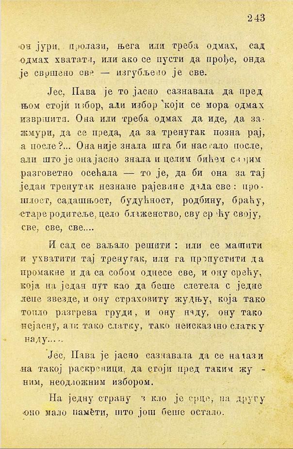 Јес, Пава је то јасно сазнавала да пред њом стоји избор, али избор који се мора одмах извршити. Она или треба одмах да иде, да зажмури, да се преда, да за тренутак позна рај, а после?... Она није знала шта би настало после, али што је она јасно знала и целим бићем својим разговетно осећала — то је, да би она за тај један тренутак незнане рајевине дала све: прошлост, садашњост, будућност, родбину, браћу, старе родитеље, цело блаженство, сву срећу своју, све, све, све....